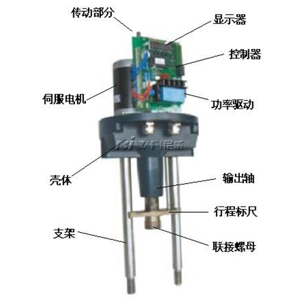 其电动执行器主要是由相互隔离的电气部分和传动部分组成,电机作为连接两个隔离部分的中间部件。电机按控制要求输出转矩,通过多级正齿轮传递到梯形丝杆上,梯形丝杆通过螺纹变换转矩为推力。因此梯形螺杆通过自锁的输出轴将直线行程传递到阀杆。执行机构输出轴带有一个防止传动的止转环,输出轴的径向锁定装置也可以做动位置指示器。输出轴止动环上连有一个旗杆,旗杆随输出轴同步运行,通过与旗杆连接的齿条板将输出轴位移转换成电信号,提供给智能控制板作为比较信号和阀位反馈输出。同时执行机构的行程也可由齿条板上的两个主限位开关开限制,并由两机械限位保护。